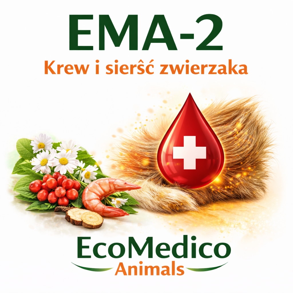 Formuła EMA-2 wspiera naturalną kondycję skóry i sierści zwierzęcia oraz pomaga przy problemach takich jak matowa sierść, wypadanie włosa czy osłabienie kondycji skóry. Produkt inspirowany jest zasadami Tradycyjnej Medycyny Chińskiej, które zakładają wzmacnianie krwi oraz odżywianie tkanek organizmu.